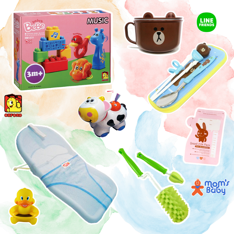 主要項目有 遊戲地墊、固齒器、防護產品(防撞條、門擋、櫥櫃鎖...)、兒童學習餐具、學步鞋、母乳冷凍袋、防溢乳墊、奶瓶刷、兒童玩具、寶寶積木、洗澡玩具...